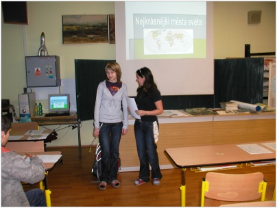 Žákyně IX. třídy - Adéla Belková a Kateřina Janečková v rámci zeměpisu zpracovaly projekt – NEJKRÁSNĚJŠÍ MĚSTA SVĚTA. Tento dvouhodinový projekt prezentovaly všem žákům na druhém stupni. Prezentace obsahovala 17 měst světa na sto snímcích v PowerPointu. Na závěr projektu připravily svým spolužákům v deváté třídě soutěž v pojídání špaget ( Itálie – Řím ). Projekt sklidil velký úspěch!!!!!!!