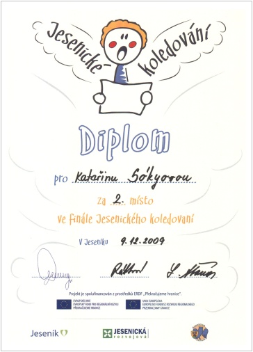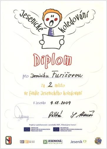 Ve středu 9. 12. 2009 se čtyři naše žákyně Dominika Furišová, Sabina Furišová ze 7. třídy, Kateřina Sókyová a Karolína Turická z 8.třídy zúčastnily mezinárodní česko – polské soutěže ve zpěvu „ Jesenické koledování“. Děvčata zpívala vždy dvě koledy. Jednu, kterou si vybraly samy, znaly ji, líbila se jim a druhou, která byla součástí zpěvníku pro tuto soutěž vytvořeného.