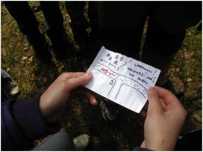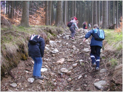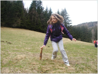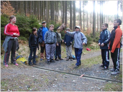 V okolí každé křižovatky, žáci museli hledat svitek, na kterém byla mapa, pomocí které bylo možné dále pokračovat v cestě. Dále jsme museli zdolat strmý kopec Miroslav, pod jehož vrcholem čekala žáky soutěž v hodu přírodním kladivem, což byl další z úkolů Lesního muže.